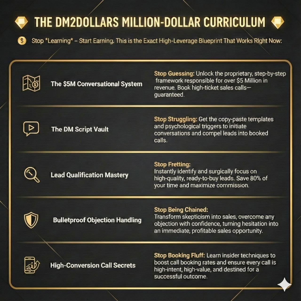 The DM2DOLLARS System is the step-by-step framework that shows you how to land high-ticket DM setting roles and drive massive revenue for businesses, enabling you to earn $1,000+ per week using proven conversational sales scripts